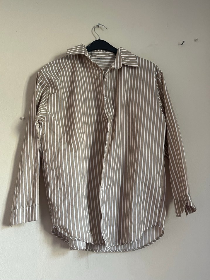 Bej çizgili keten kumaştan, uzun kollu, düğmeli ve yakalı kadın gömleği. Salaş kesim ve midi boyda, günlük kullanım için uygun.