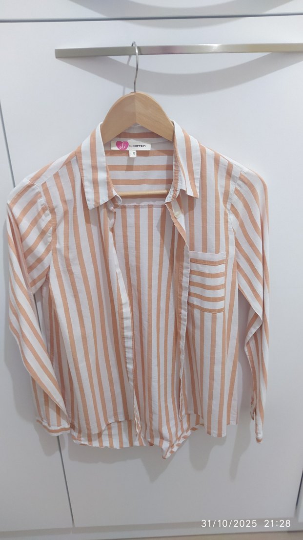Yumuşak pamuktan, bej pastel çizgili, uzun kollu, düğmeli ve yakalı, rahat kesim kadın gömlek. Günlük sokak stili için uygundur.