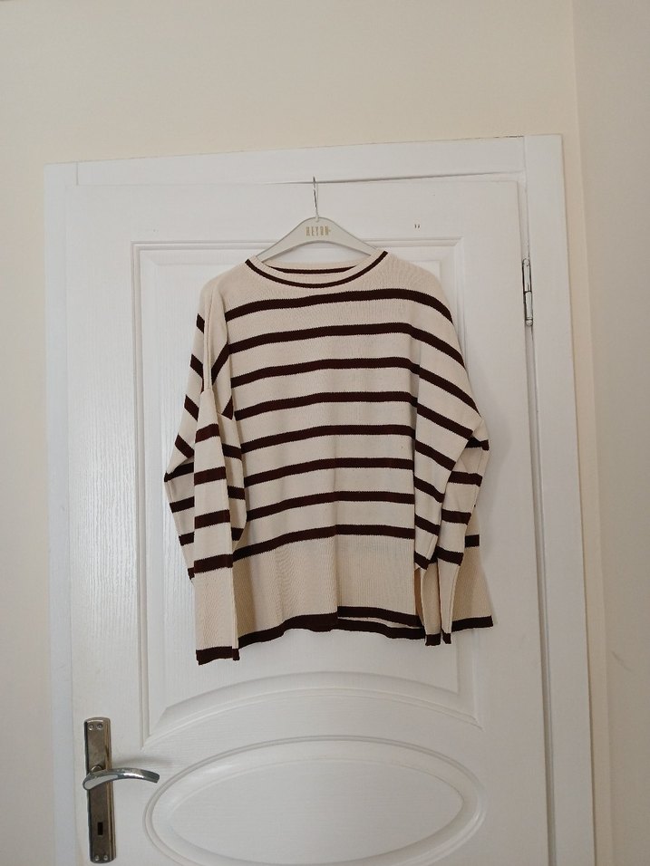 Bej Çizgili Uzun Kollu Triko Kazak
