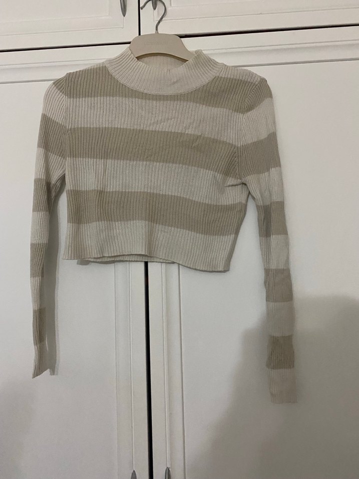 Bej ve gri çizgili, uzun kollu ve bisiklet yaka, triko kumaştan yapılmış, günlük kullanım için rahat ve trend bir sokak stili kazak.