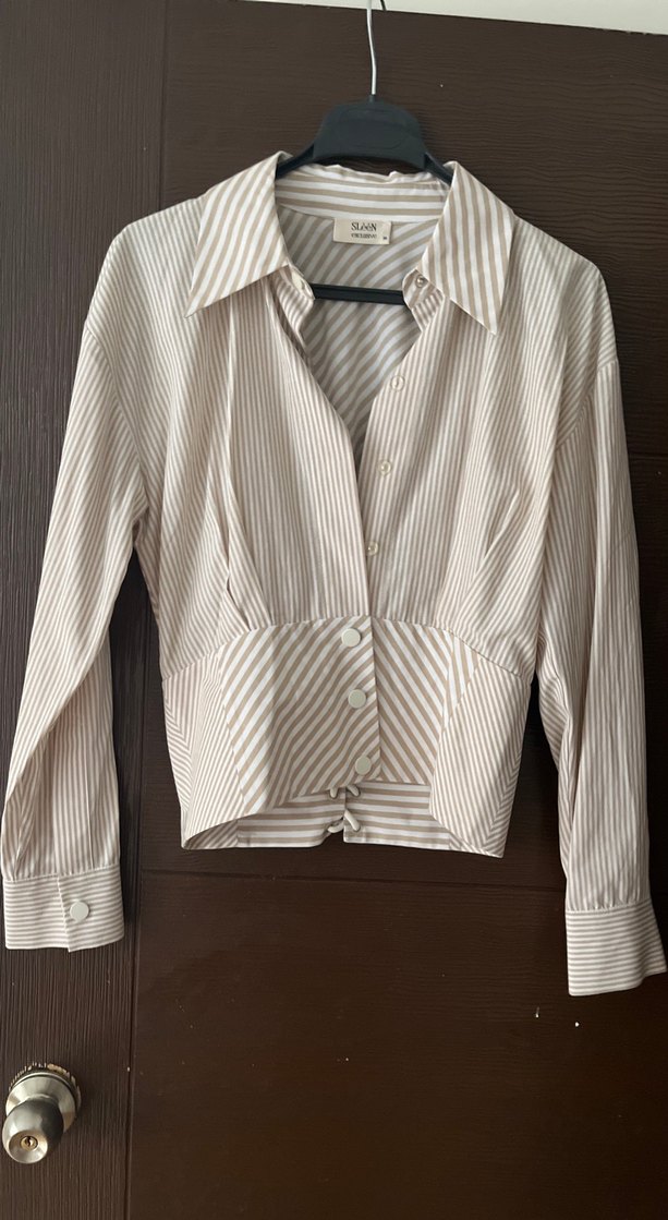 Bej renkli, uzun kollu, V yakalı, düğmeli kadın gömleği. Pamuklu, çizgili desene sahip, kısa ve regular fit kesim. Ofis ve günlük sokak stiline uygun.