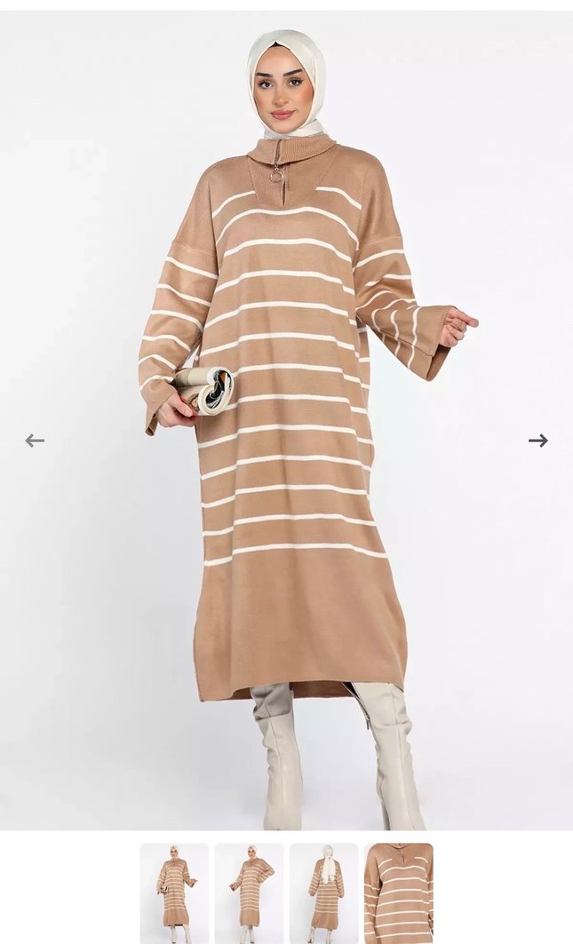 Bej renkte, beyaz çizgili uzun triko elbise. Yüksek yakalı, bol kesim ve yumuşak sentetik kumaştan üretilmiştir. Rahat sokak tarzı için uygundur.