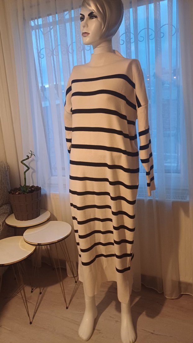 Bej renkli, uzun ve bol kesim triko elbise, siyah yatay çizgiler ve boğazlı yakaya sahiptir. Yumuşak sentetik kumaştan üretilmiştir.