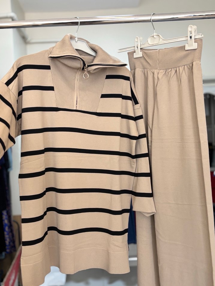 Bej Çizgili Uzun TrikoTakım