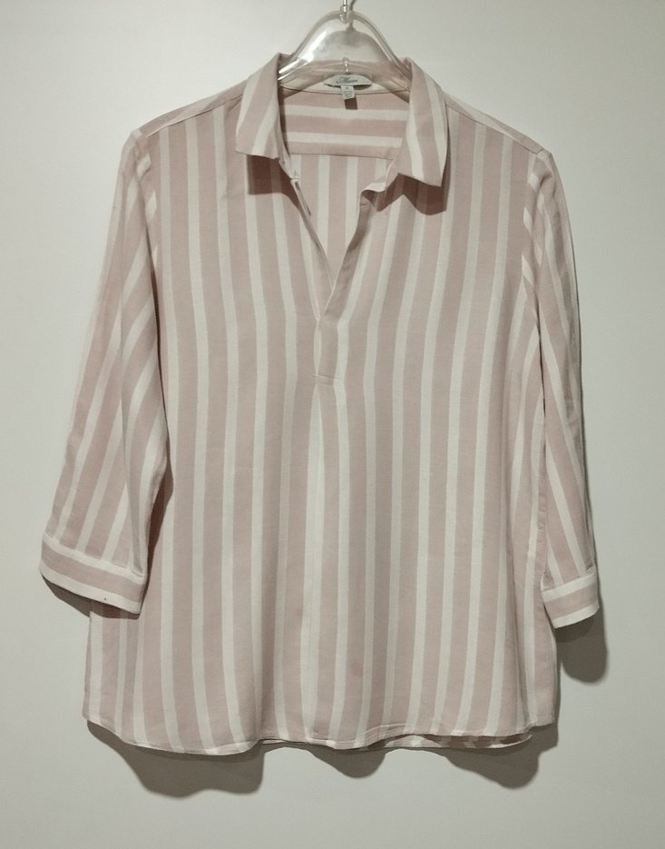 Bej renkte, pastel çizgili, V yaka ve düğmeli kısa kollu, rahat kesim kadın gömleği. Yumuşak sentetik kumaştan, günlük kullanıma uygun.