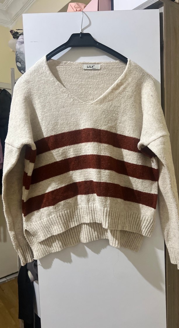 Bej renkte, uzun kollu ve V yaka örgü kadın kazak. Gri ve kahverengi yatay çizgilerle rahat ve salaş bir görünüm sunar.