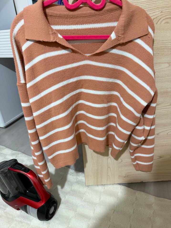 Bej ve beyaz çizgili, V yakalı uzun kollu örgü kazak. Rahat kesimi ve midi boyuyla günlük kullanıma uygun, trend sokak stili kazak.