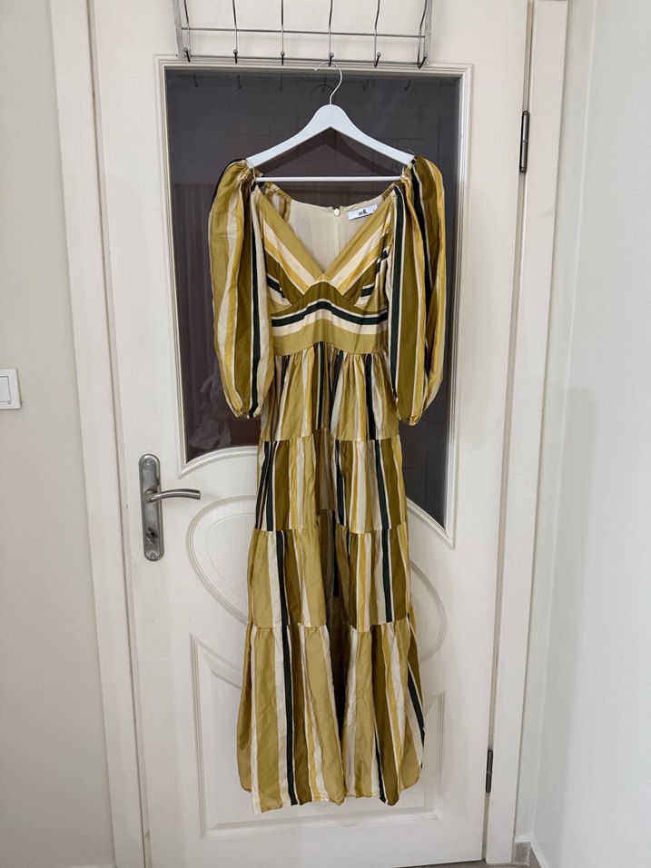 V yaka ve bol kesime sahip uzun bej elbise, askılı ve drapeli kollarla. Parlak çizgili deseni ve bohem tarzıyla günlük kullanıma uygun.