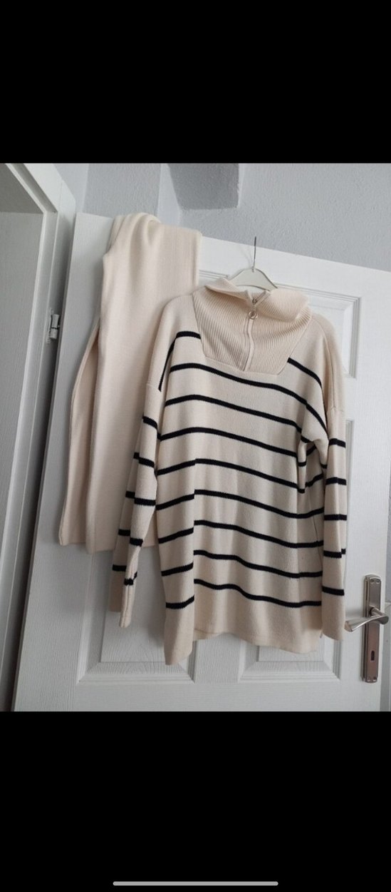 Yarım fermuarlı yüksek yakalı, uzun kollu ve bol kesim bej renkli çizgili triko kazak. Rahat ve günlük kullanıma uygun.