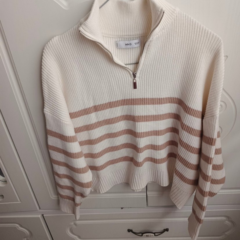Yarım fermuarlı, yüksek yakalı bej renkli, pastel çizgili örgü kazak. Salaş kesimi ve uzun kollarıyla günlük rahat sokak stiline uygun.