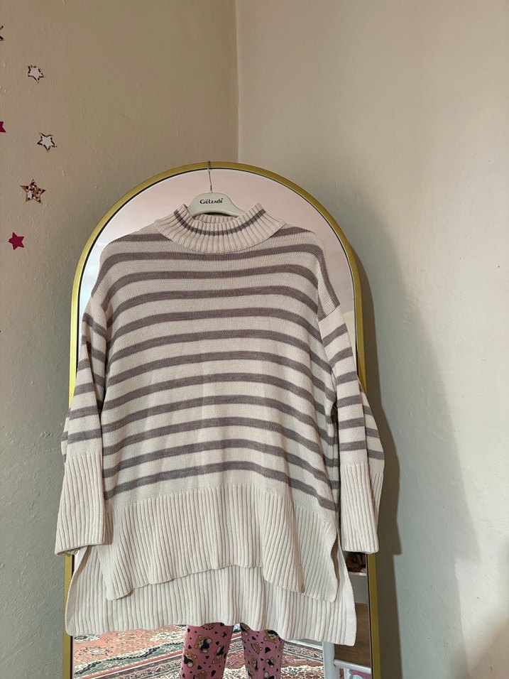 Bej renginde, çizgili desene sahip, yüksek yakalı ve uzun kollu örgü kadın kazak. Bol kesim ve midi boy ile rahat bir stil sunar.