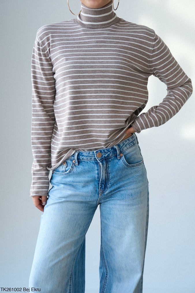 Bej çizgili, yüksek yakalı ve uzun kollu, bol kesim kadın kazak. Denim görünümlü kumaştan, gündelik şıklık için uygun.