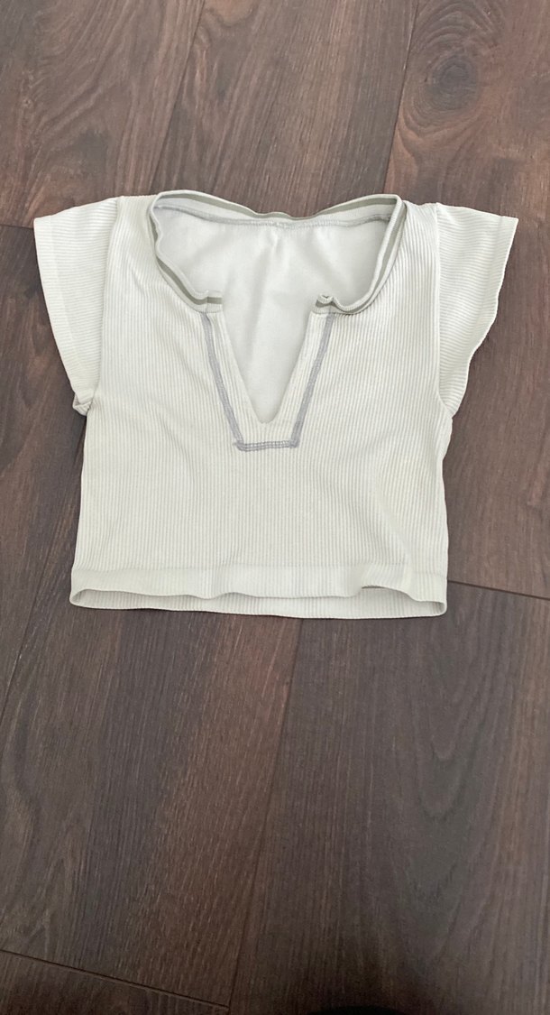 Bej renkli çocuk atleti, V yaka ve kısa kollarda gri detaylarla yumuşak ve rahat kumaştan üretilmiştir. S beden sporcu