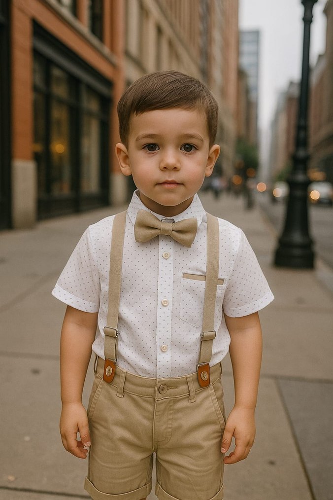 Açılabilir tokalı, açık bej pamuk askılar, çocuklar için rahat takim. Papyon desenli gömlek ile muhtesem uyum . 5-8 yaş arası mevcuttur alırken yaş bildiriniz