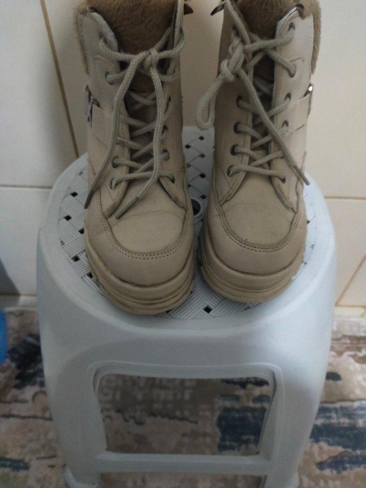 Bej renkte, tokalı detaylı dolgu topuklu botlar. Dayanıklı kauçuk materyalden üretilmiş, gri tonlarda ve desensizdir.