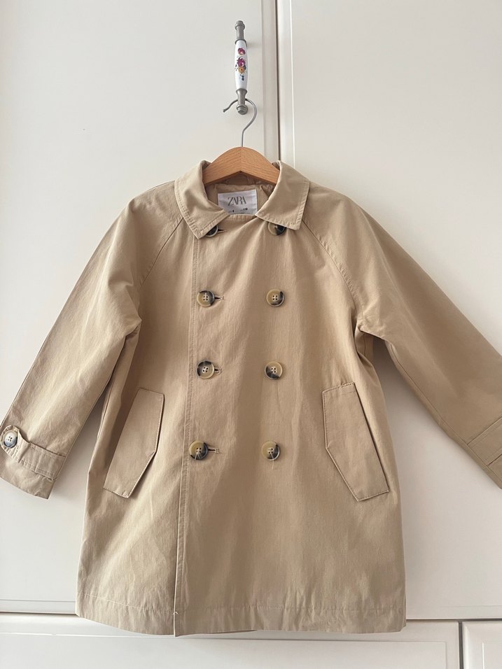 Bej renkli, düğmeli ve klasik yakalı çocuk kabanı. Yumuşak keten kumaştan, regular fit ve desensiz tasarım.