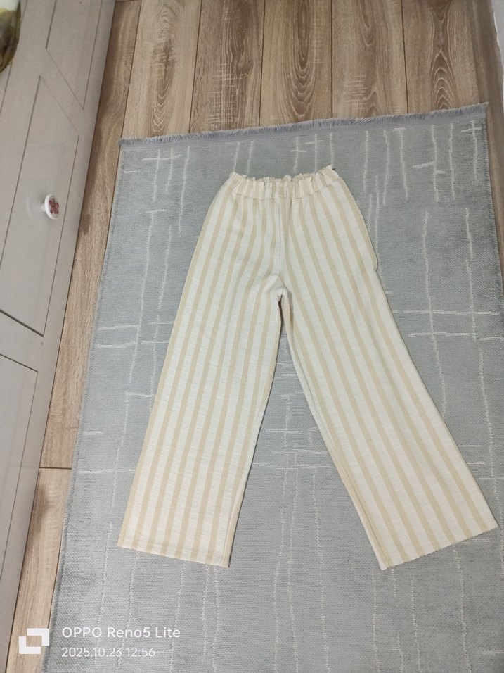 Bej renkli keten kumaştan, pilili detaylı, normal kesim ve midi boy çocuk pantolon. Rahat ve sade normcore tarzına uygun.