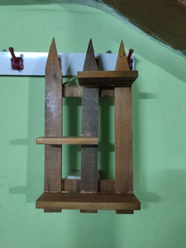 Koyu tonlu bej ahşaptan yapılmış, küçük kuleleri andıran sivri uçlu çocuk rafı. Eşyalar için düzenleyici olarak kullanılabilir.