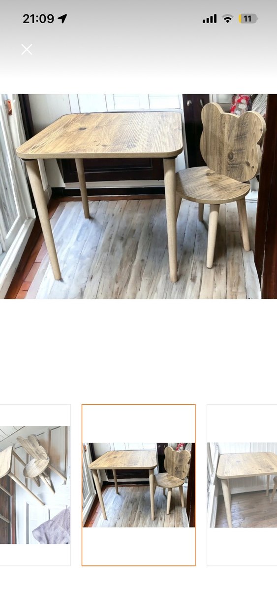 Ayı şeklinde sırt dayanağı olan bej çocuk sandalyesi ve uyumlu ahşap masa seti. Doğal, pürüzsüz yüzeye sahip.