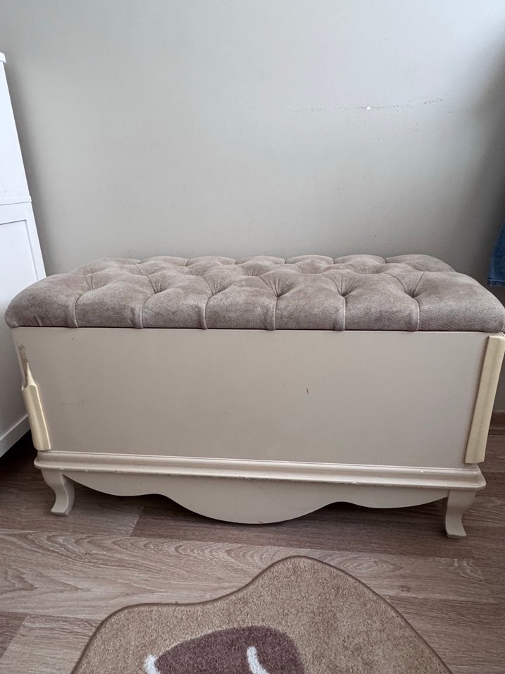 Yumuşak, düğmeli capıcuno minderli bej çocuk şifonyeri, hem depolama hem oturma alanı sağlar.eni 42 boyu 53cm