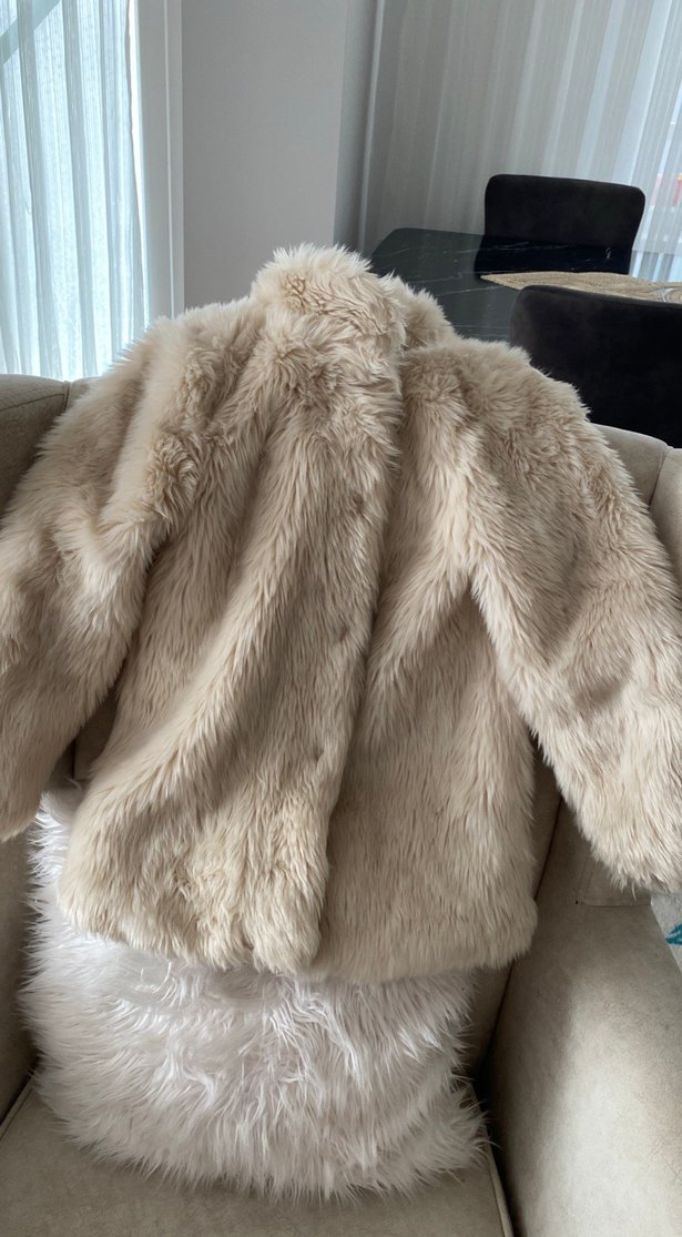 Bej renkli, uzun kollu ve vücuda oturan suni kürk ceket. Yumuşak sentetik kumaştan, günlük kullanım için uygundur.