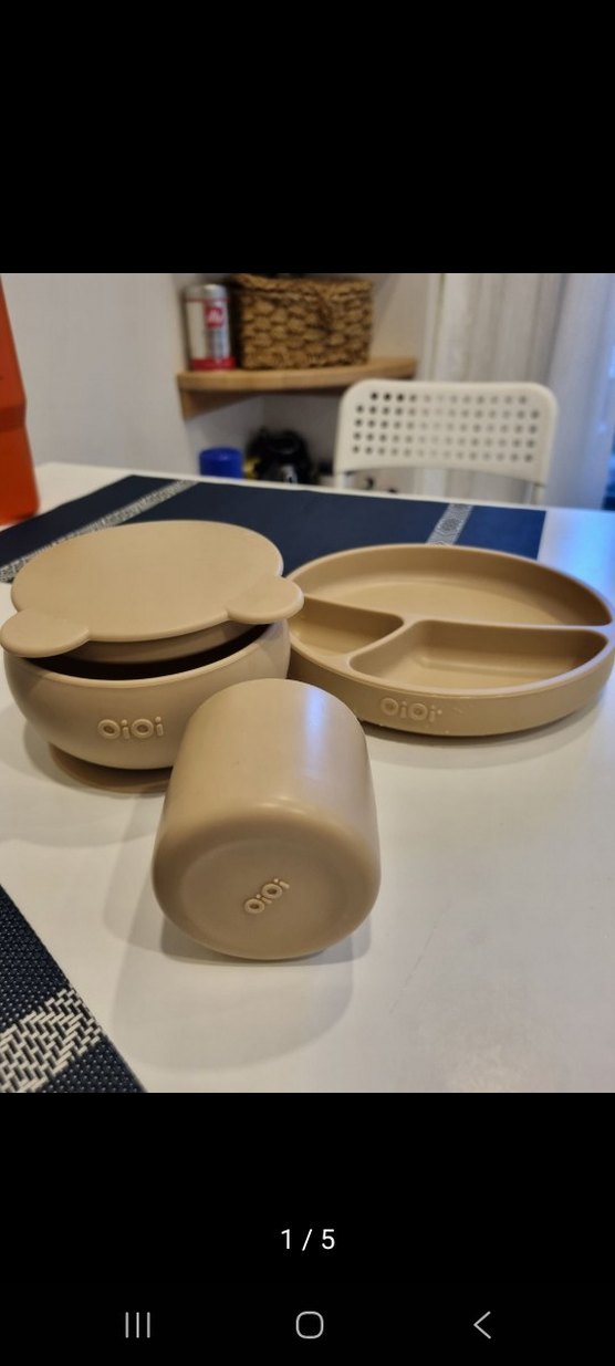 Bej renkli çocuk tabak, bölmeli tabak, kapaklı kase ve bardaktan oluşan set. Çocuklar için uygun, kullanışlı ve düzenli yemek sunumu sağlar. ️