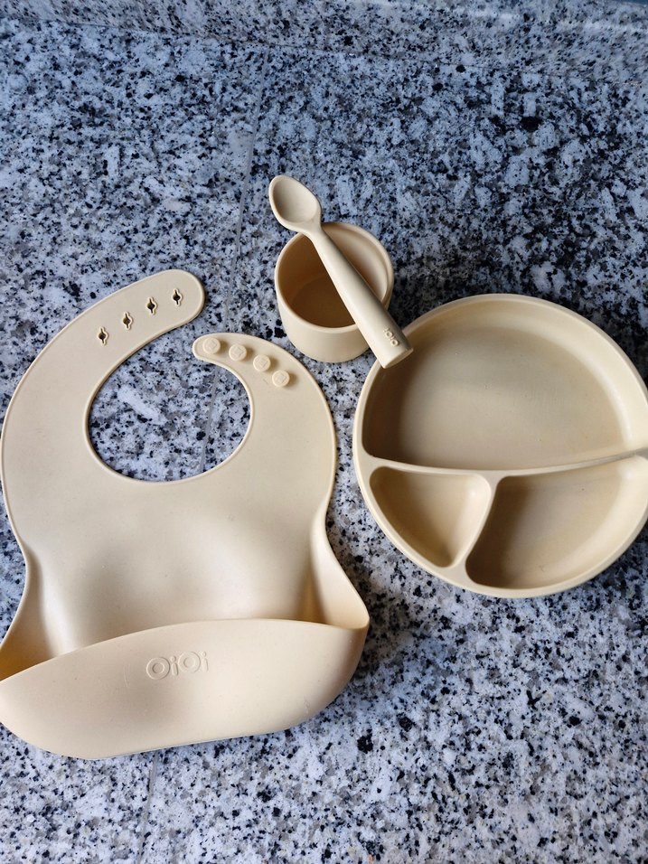 Bej renkli, bölmeli tabak, kaşık, bardak ve ayarlanabilir önlükten oluşan çocuk yemek seti. Kolay temizlik sağlar. ️