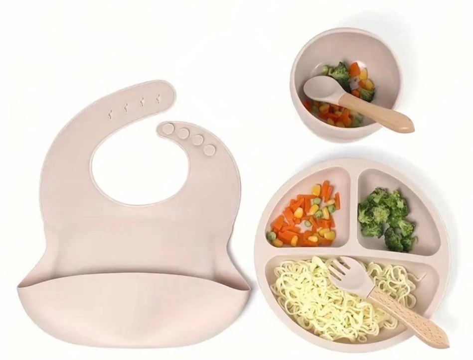 Bej renkte, bölmeli tabak, çatal, kaşık ve yumuşak malzemeden yapılmış önlük içeren çocuk seti. ️