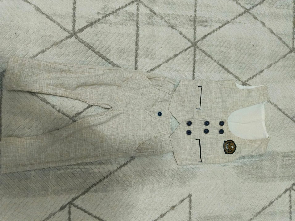 Bej renkli, düğmeli çocuk takım elbise Bohem tarzıyla trend görünümler için uygun. bir kusuru yoktur aynı takımın 3 yaşı da mevcut