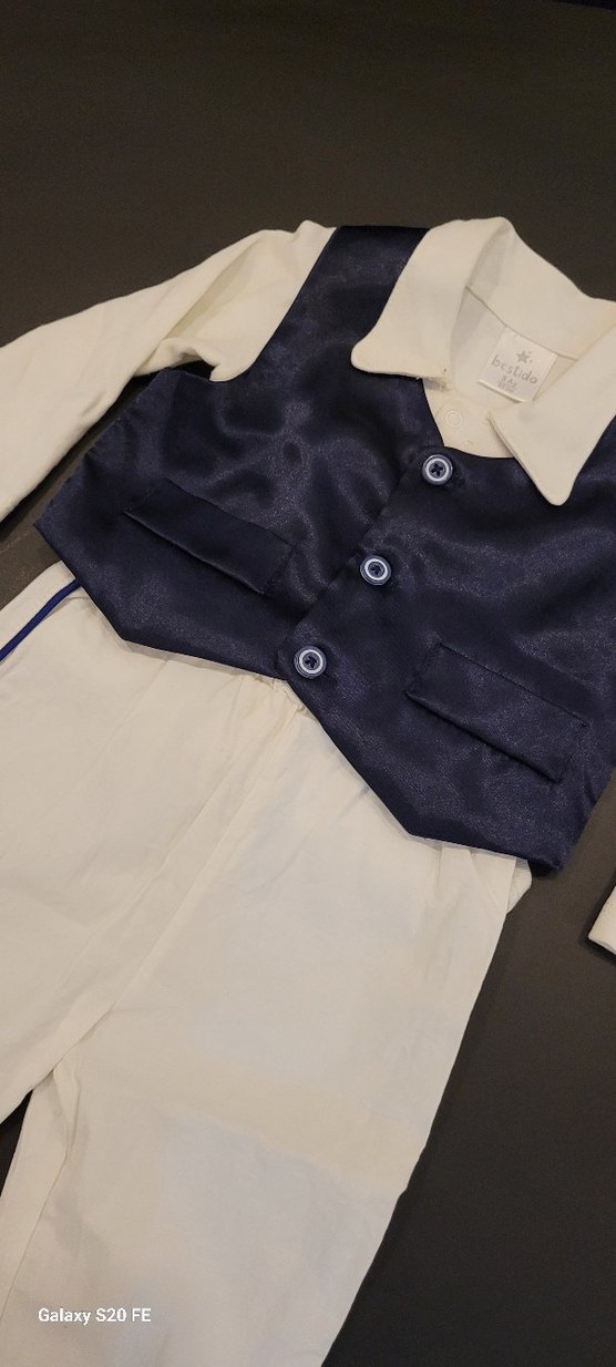 sunnet sonrasi foto cekiminde 1 kez giyilmistir. Bej renkte, düğmeli parlak lacivert yelek ve çentikli yakalı kolsuz çocuk takımı. Rahat ve klasik kesimle tasarlanmıştır.