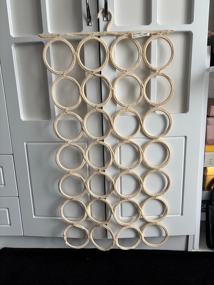 Bej renkte çoklu halkalardan oluşan askı düzenleyici, dolabınızda alan tasarrufu sağlar.