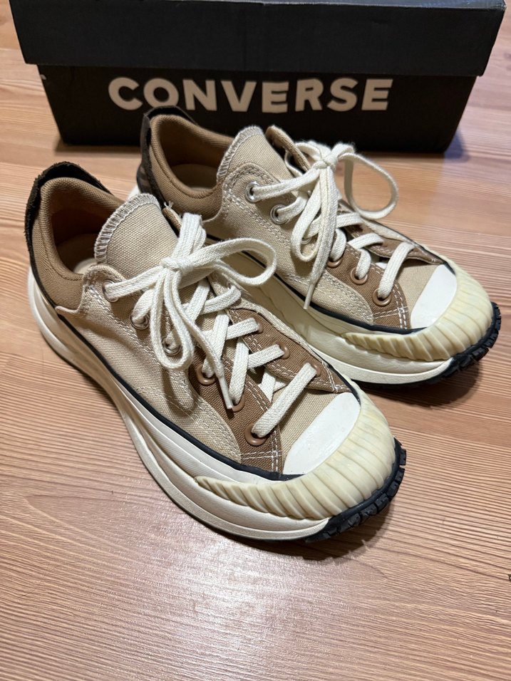 Bej Converse kadın spor ayakkabısı, kauçuk malzemeden, dolgu topuklu ve fırfır detaylıdır. Trendy casual sokak stili ve günlük kullanım için uygundur. Desensiz, gri tonlarda. ONVARSE yazısı bulunur. Çok az kullandım. Taşınacağım için satıyorum. İsteyene detaylı fotoğraf atacağım. Kutunun üzeri silinmekten yıprandı.