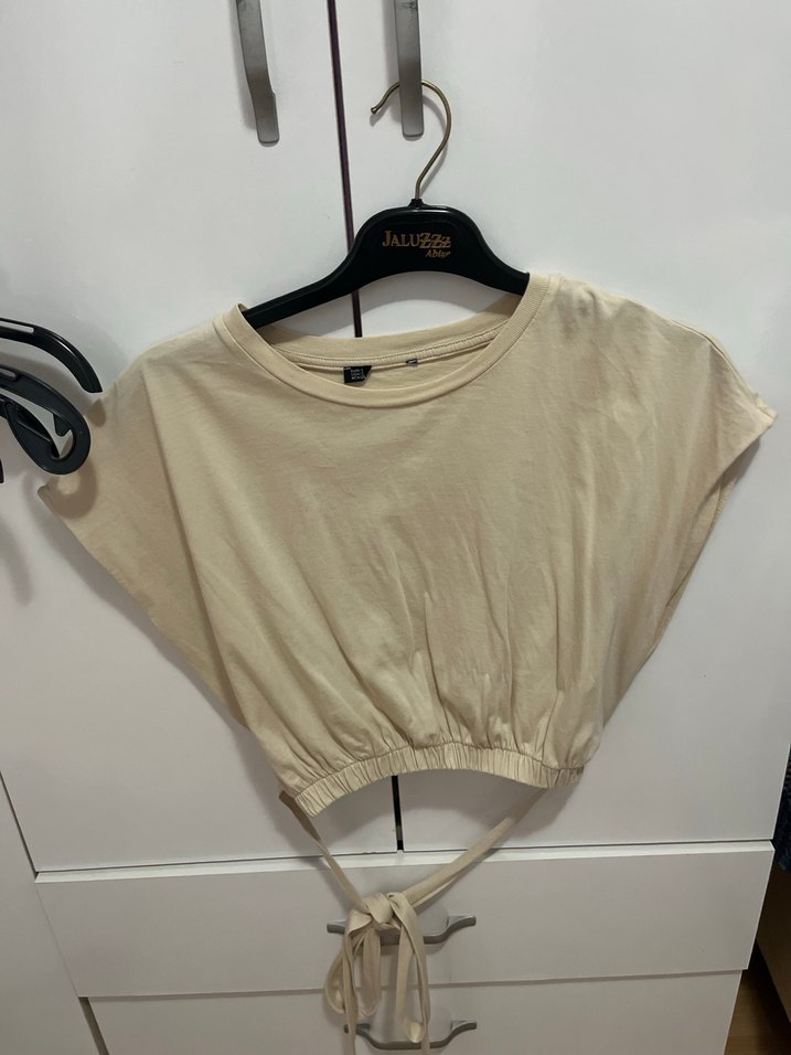 Bej renkli crop top, yuvarlak yaka ve kısa kolludur. Bol kesim, lastikli ve bağcıklı alt kısmıyla rahat bir sokak stili sunar.