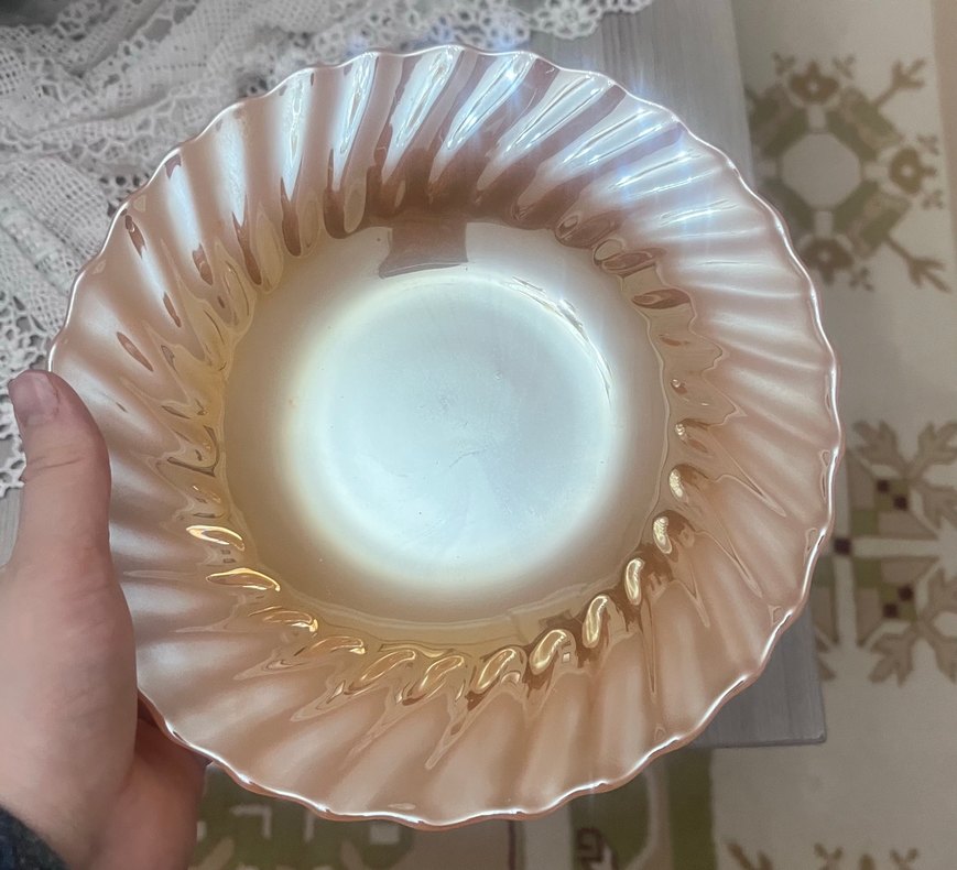 Bej renkte, dalgalı kenar tasarımlı cam kase. Hafif tonu ile sofralara zarif bir dokunuş katar. ️ Vintage İtalyan Termocrisa opal cam, sedefli pembe, dalgalı kenar – 1960’lar 12 adettir.