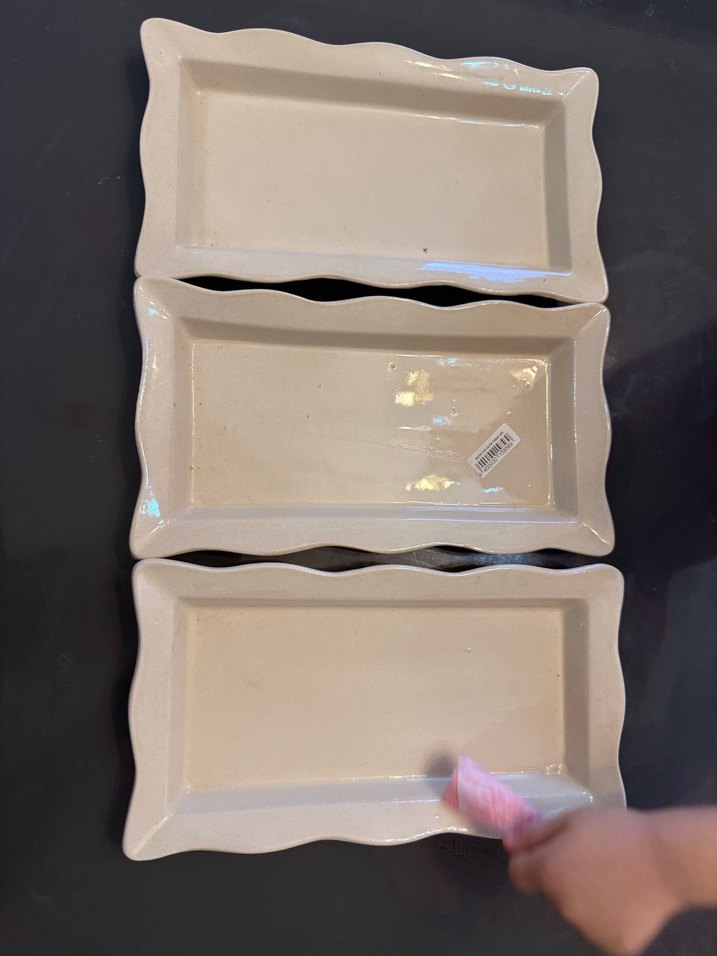 Bej renkte, dalgalı kenarlara sahip dikdörtgen tabaklar. Hafif ve sade tasarımlı, yiyecek servisi için uygundur. ️3lü salatalık tabağı