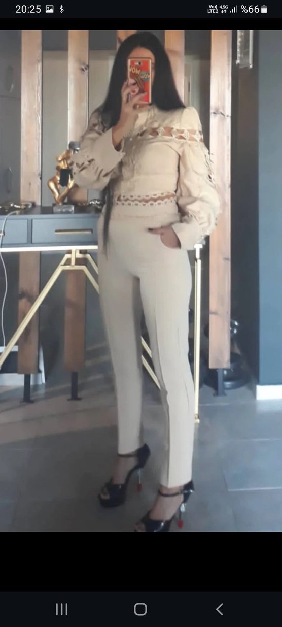 Bej Dantel bluz pantalon ikili takım