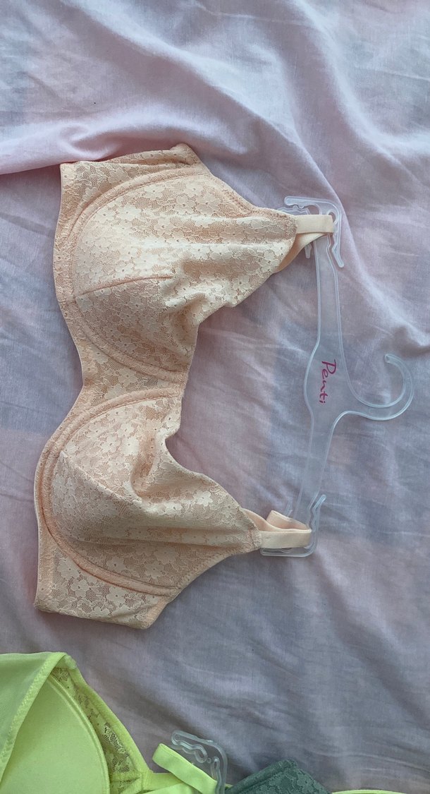 Pastel bej renkte, dantel detaylı, bohem tarzda, desensiz ve normal uzunlukta sütyen. rengi kavun içi turuncusu çok tatlı bi rengi var hiç giyilmedi 85b penti