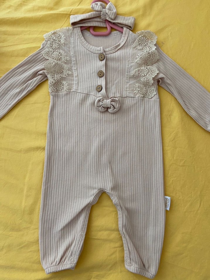 Bej renkli, yumuşak ribanalı kumaştan yapılmış dantel ve nakış detaylı bebek kız tulumu. Önünde düğmeler ve uyumlu saç bandı bulunur. Bi çıtçıtı az tutuyor onun dısında sorunsuz