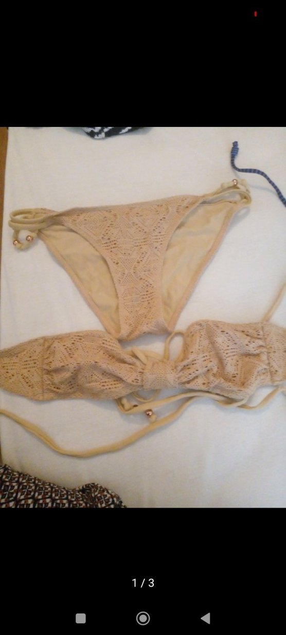 Bej renkte, dantel detaylı ve askılı, bohem tarzda, vücuda oturan bikini takımı. ️