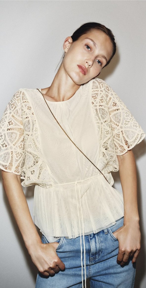 Bej renkli, pamuklu kumaştan, gevşek kesim, nakışlı dantel kısa kollu, V yakalı ve midi boy bohem tarzda bluz.
