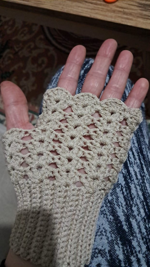Bej renkli, dantel detaylı örme kadın eldiveni. Rahat ve bohem tarzda, retro ve hippie görünüm için uygun.