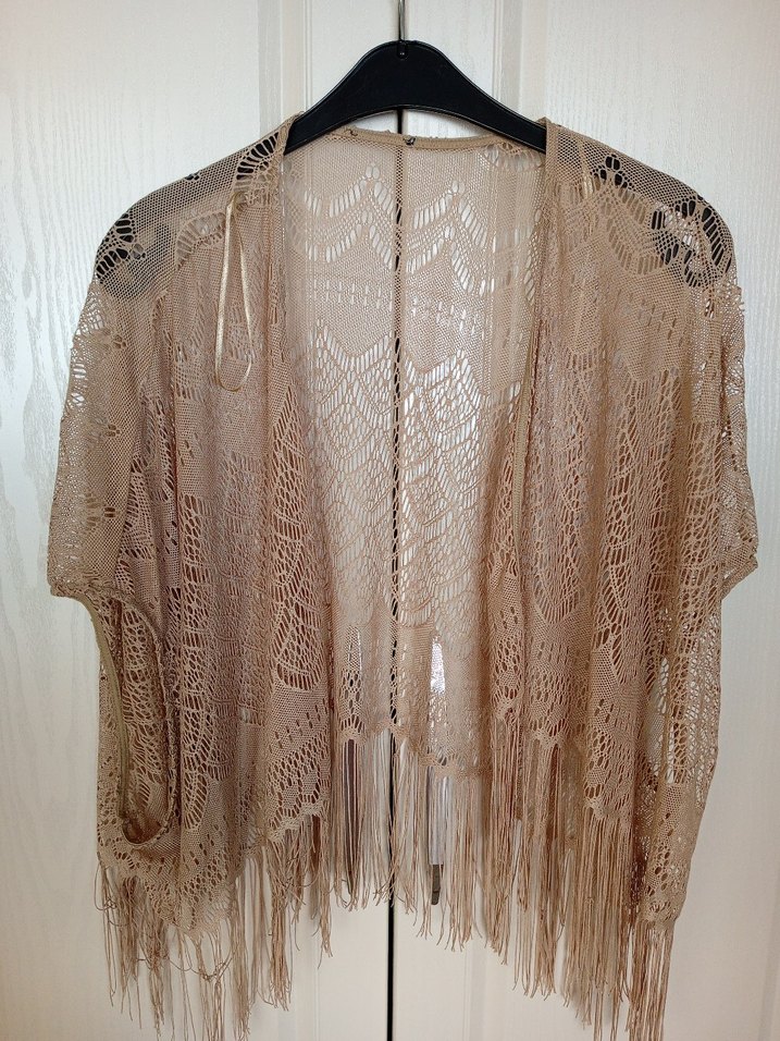 Hafif bej renkte, dantel detaylı örme kumaş ve püsküllü bohem tarzda kadın Pareo şal