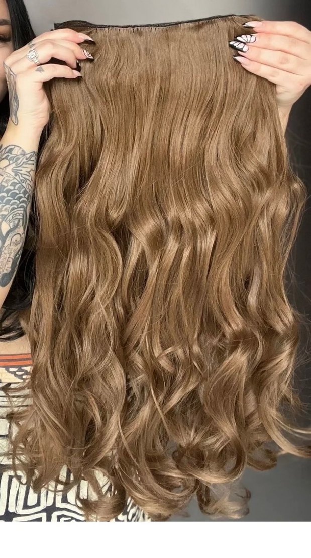Kumral renkte ve parlak bohem tarzda kadın saç (çıt çıt 3 lü). Kaynak olarak kullanabilirsiniz bu şekilde saça geçirerek uzatma yapabilirsiniz