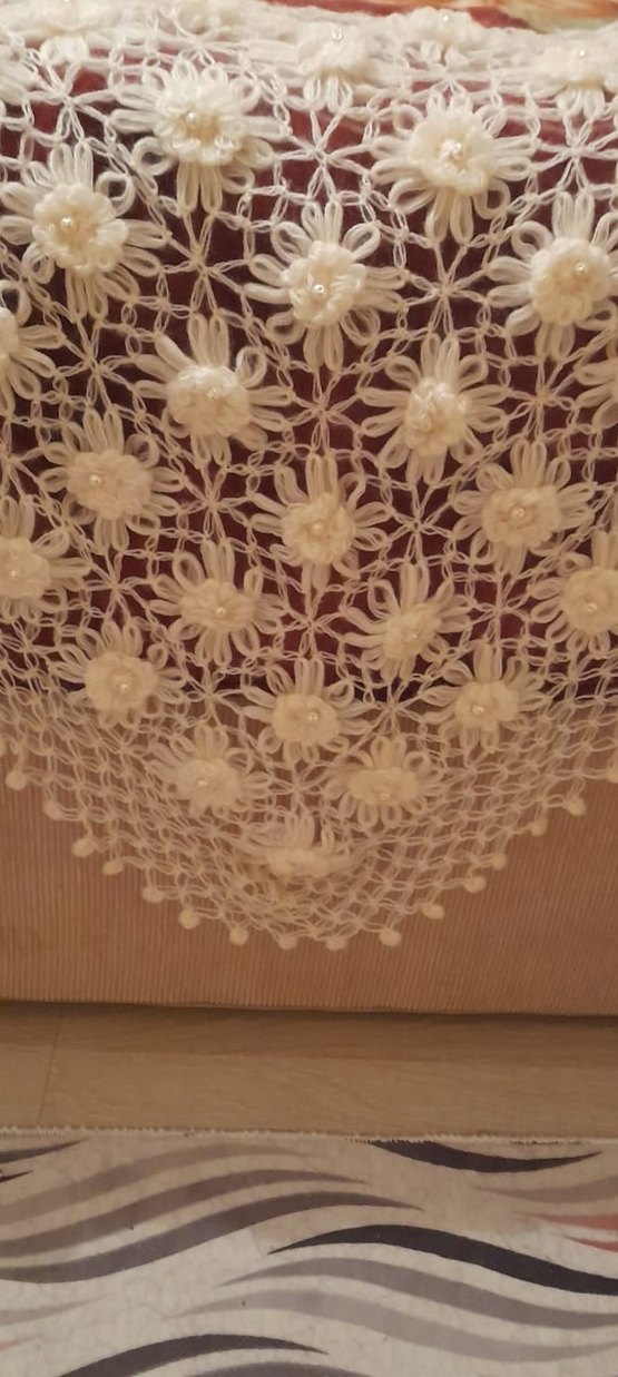 Bej renkli, dantel detaylı örgü kadın şal. Bohem ve vintage tarzda, hafif renk ve çiçek desenleriyle şık bir görünüm sunar. Boncuklu gelin şalı krem renkte 1 defa kullanıldı