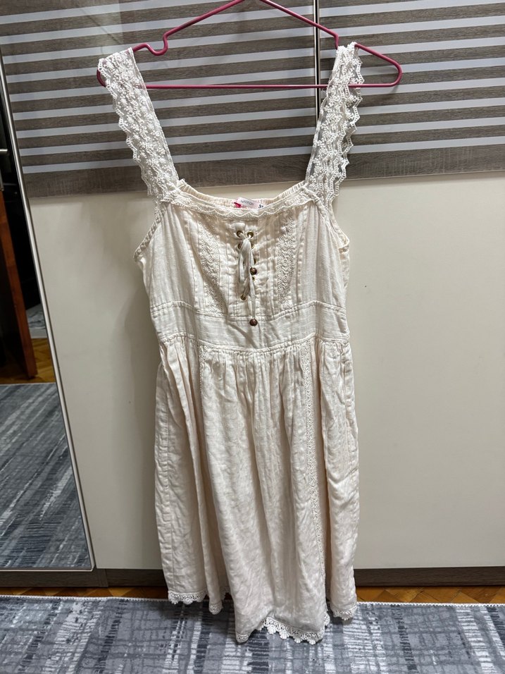 Pamuk kumaştan, dantel detaylı askılı, straplez yakalı, bol kesim bej midi bohem elbise. Günlük kullanıma uygundur.