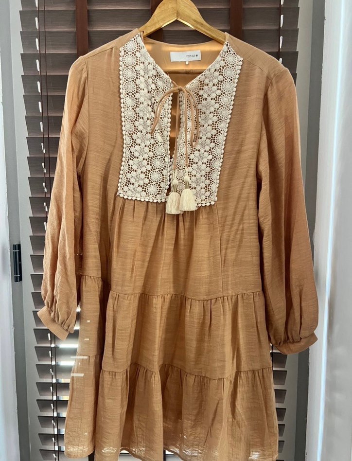 Pamuklu, dantel işlemeli, V yaka, uzun kollu, bol kesim bej midi tunik. Günlük kullanıma uygun rahat tasarım. Zara giyilmedi rahat kalıp