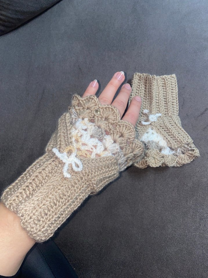 Açık bej renkli, dantel detaylı örgü eldivenler. Bohem tarzda, parmak uçları açık ve rahat bir görünüm sunar.