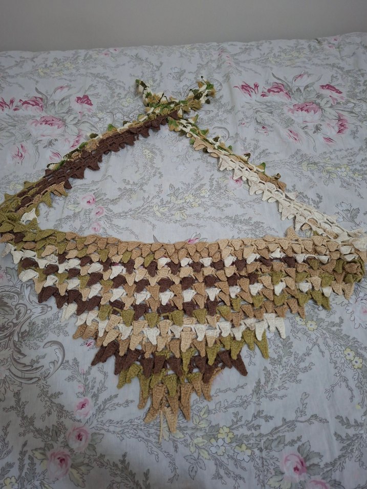 Kadınlar için bohem tarzda, örgü kumaş ve dantel detaylı fular. Açık bej tonlarında, retro ve hippie esintili, ayarlanabilir bağlama özelliğine sahip üçgen model.