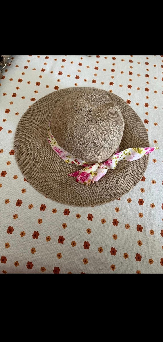 Bej renkli örgü kumaştan yapılmış, dantel detaylı ve çiçek desenli kurdeleli bohem tarzda kadın şapkası.
