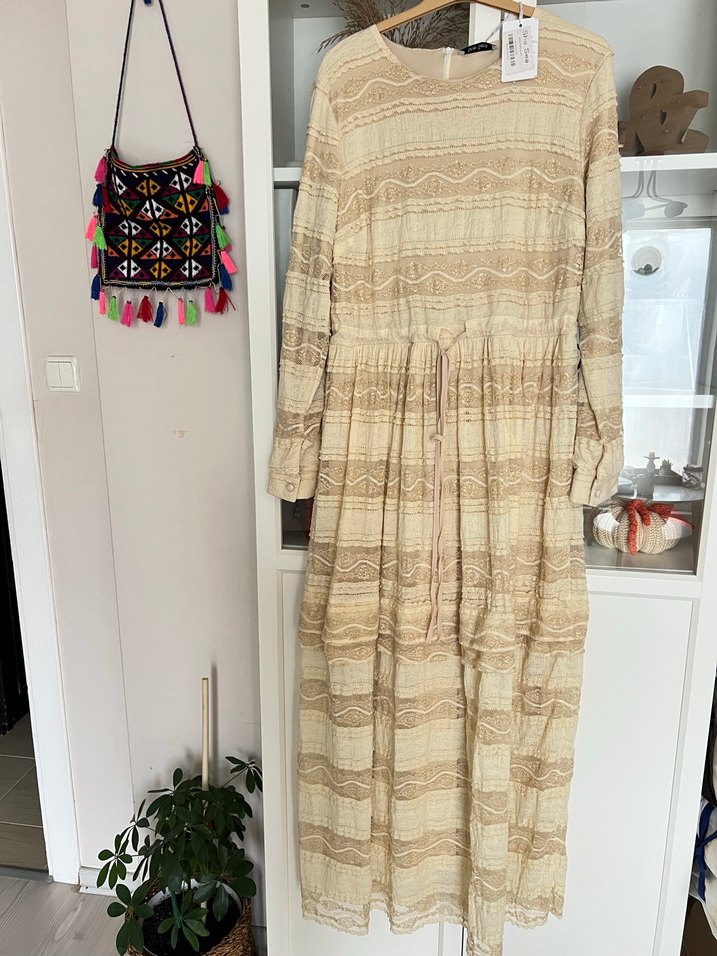 Bej renkli dantel kumaştan, astarlı ,dantel detaylı, uzun ve bol kesim bohem elbise. Kayık yaka ve uzun kolludur.